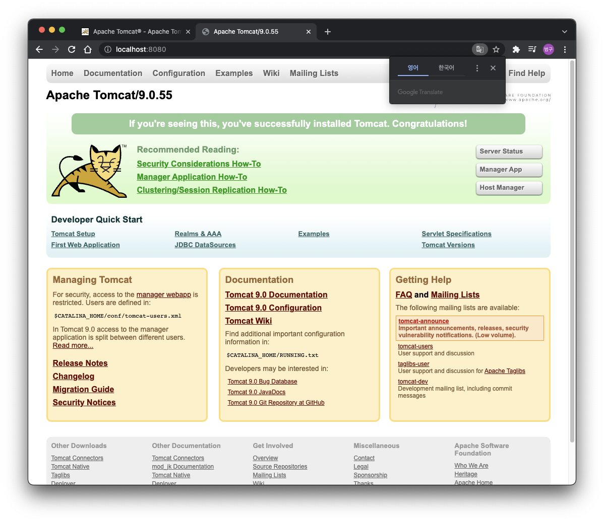 위 명령어를 통해 톰캣 서버를 구동해준 뒤, localhost:8080으로 접속해서 아래 창이 나오면 잘 설치된 것이다.