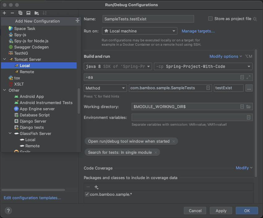 좌측 상단의 + 버튼을 클릭한 뒤 쭉 내려보다 Tomcat Server->Local 을 클릭한다.