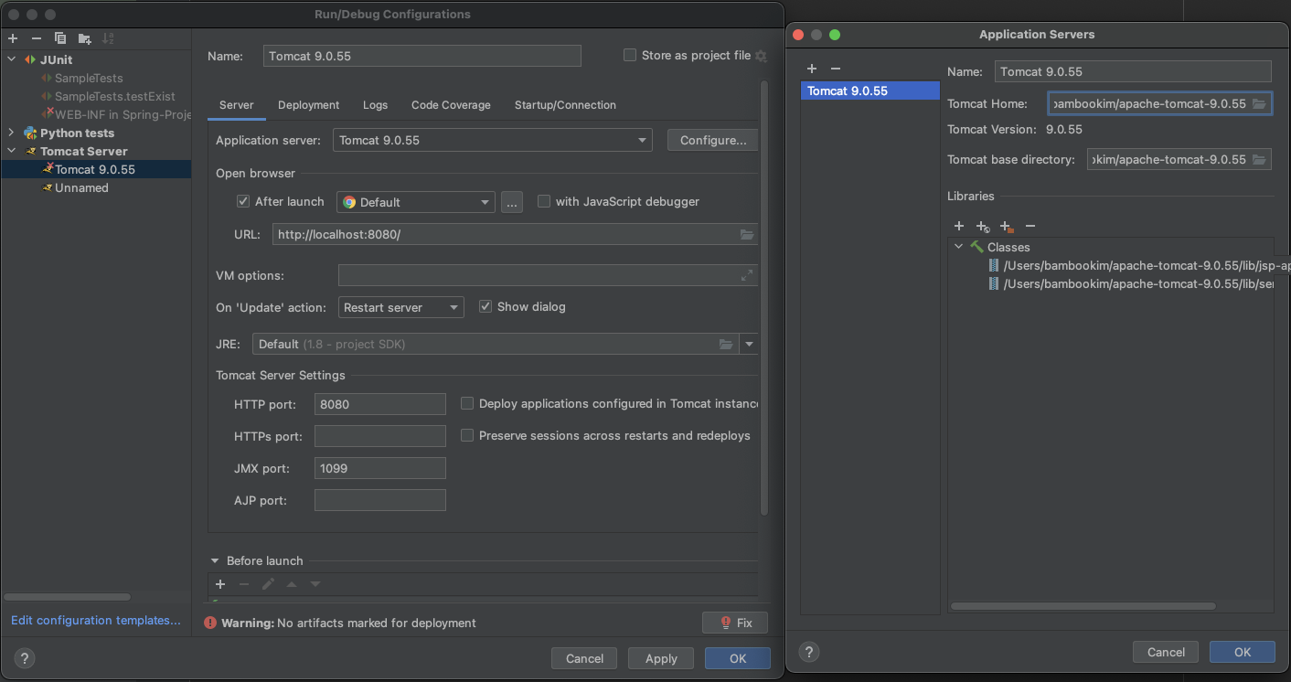 그러면 왼쪽과 같은 창이 나오는데, 위의 [Configure...] 버튼을 누르면 오른쪽 창이 나온다. 오른쪽 창의 Tomcat Home 오른쪽의 버튼을 눌러 아까 설치한 톰캣 폴더를 지정해준 뒤 [OK]를 누르고, Fix 버튼을 누른 뒤 Deployment 화면으로 이동되면 Application Context를 / 로 입력해준다.