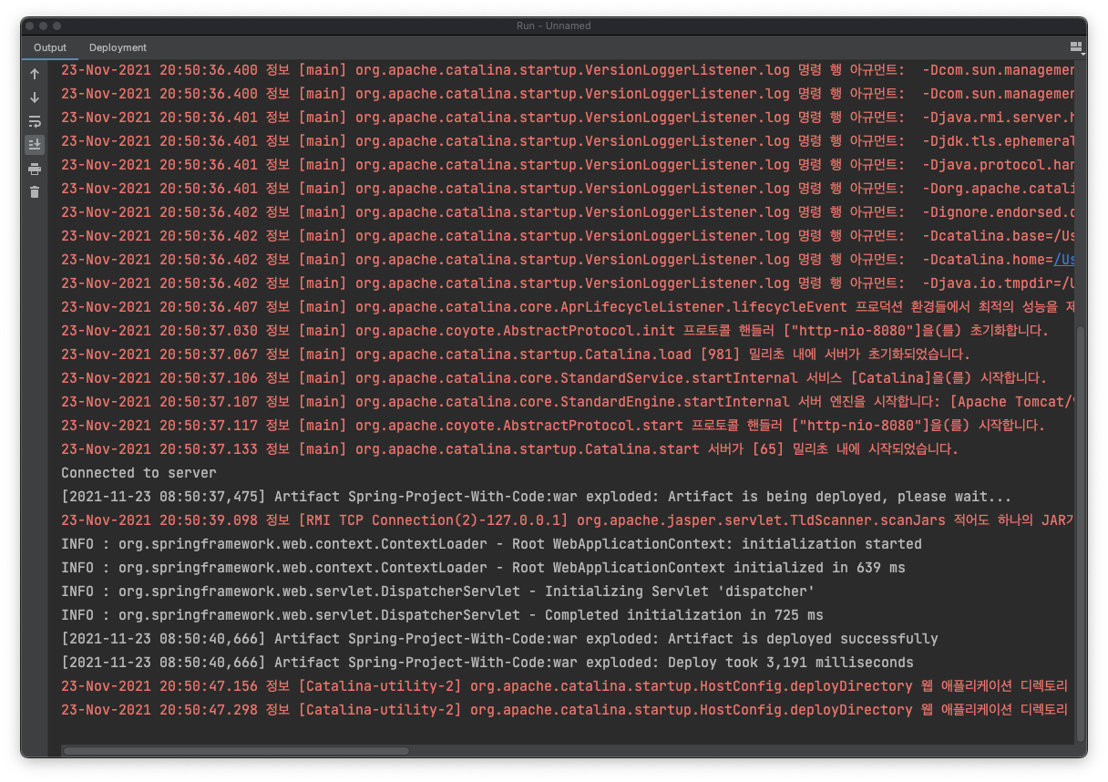 그 뒤 우측 상단에서 Tomcat Server를 실행시켜 주면 아래와 같이 구동되는것을 볼 수 있다.