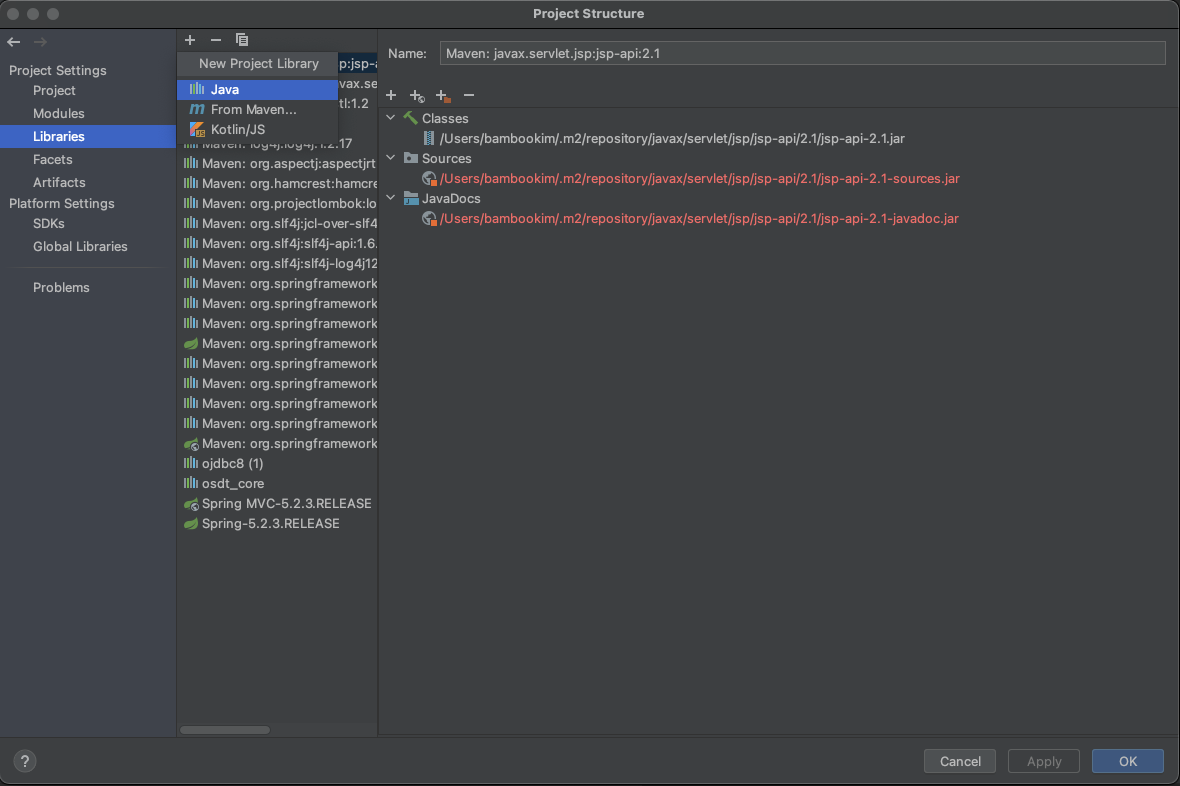[Libraries] -> [+] -> [Java] 순으로 클릭한 뒤 다운받은 4개의 jar 파일들을 지정하고 [Apply] 눌러주자.